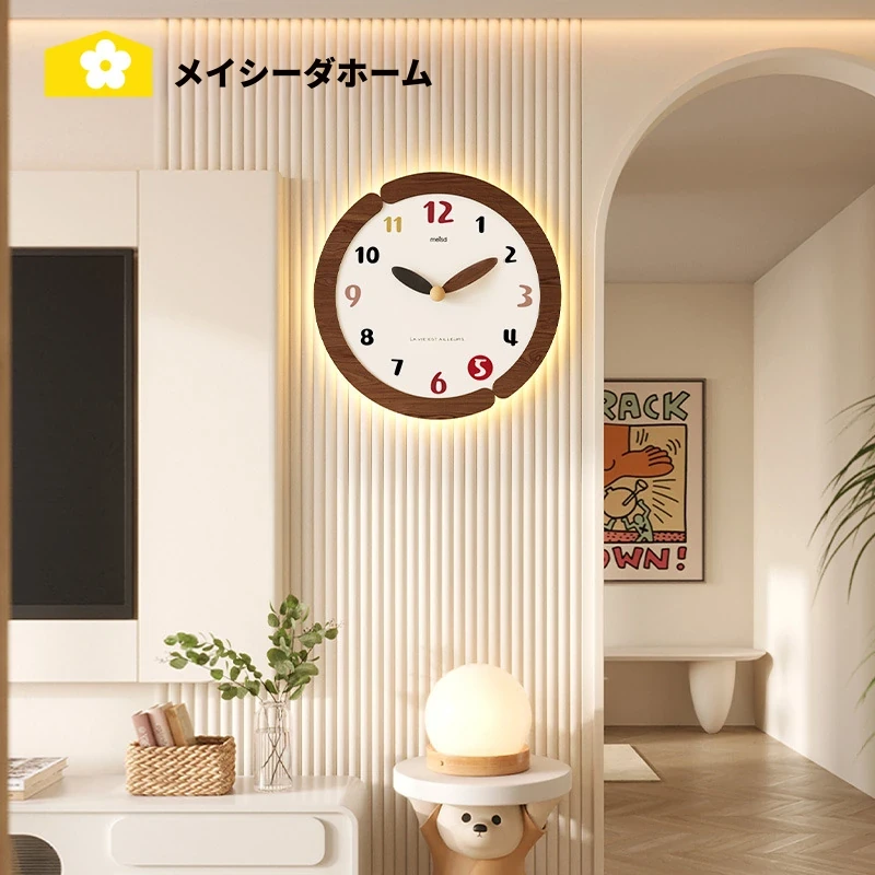 2025年新作!ナチュラルウッド風のモダンシンプル掛け時計 - おしゃれなクリームカラーで、リビングにぴったりのアイテム。創造的なデザインと壁面照明機能を兼ね備えた家用時計で、温かみのある空間を演出します。