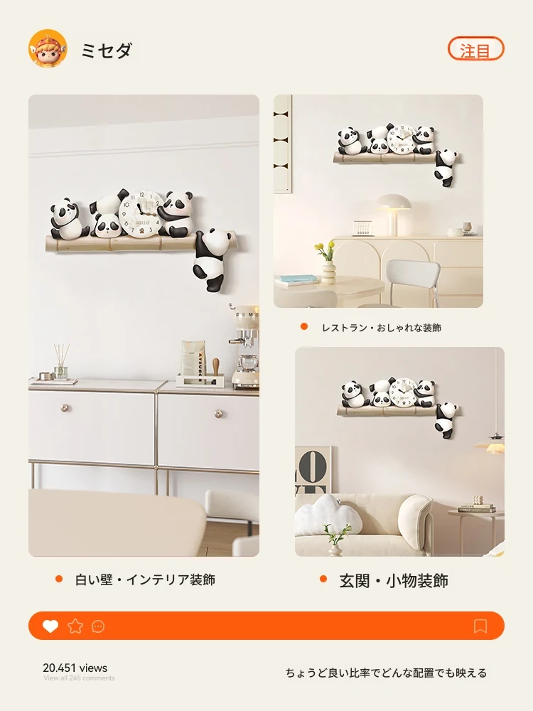 美世达パンダ掛け時計2025年新作!静音設計で快適なリビング空間を演出。おしゃれで創造的なデザインは、ダイニングやリビングにぴったり。あなたの家に個性をプラスするアイテムです!