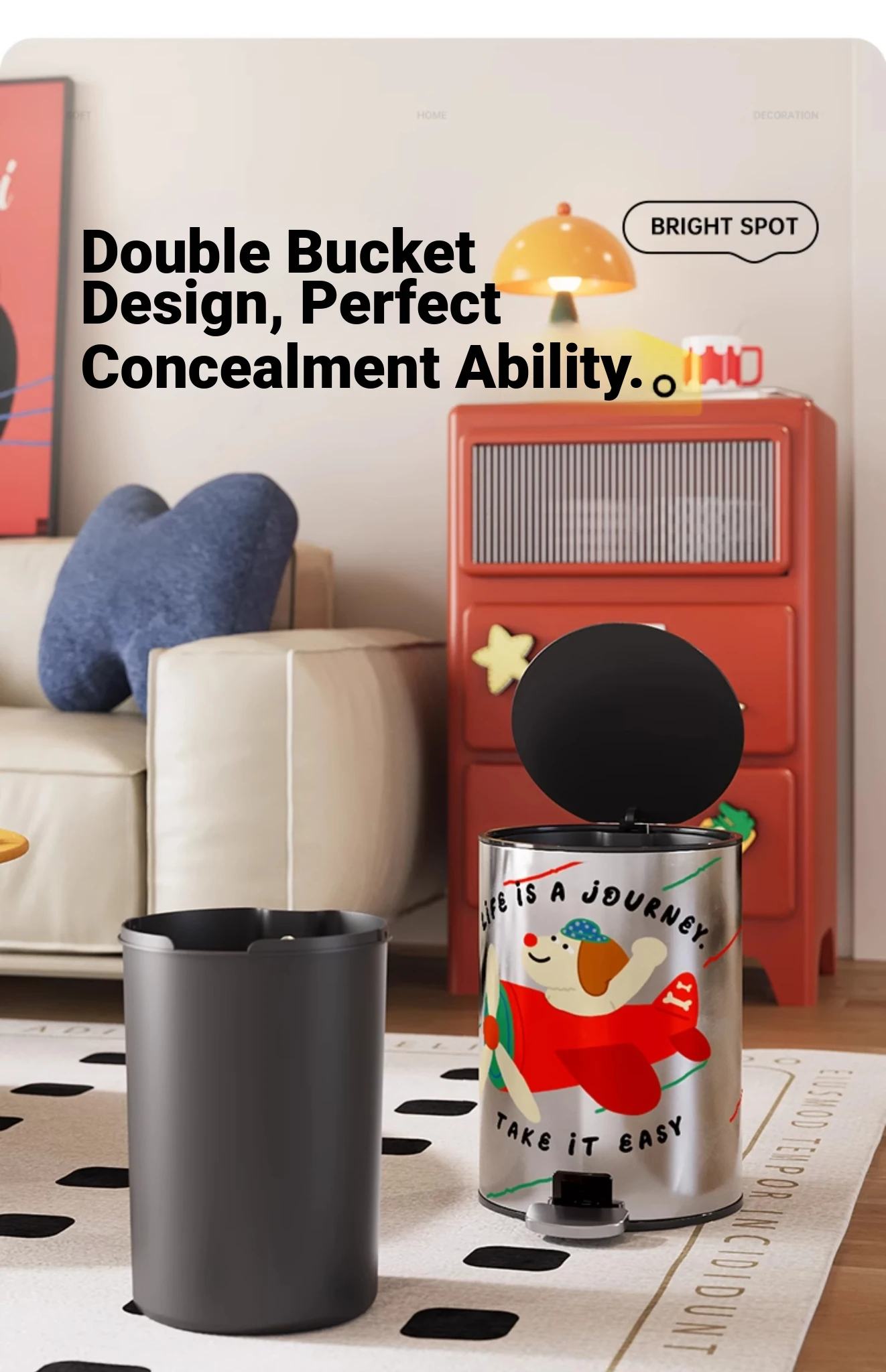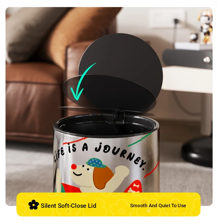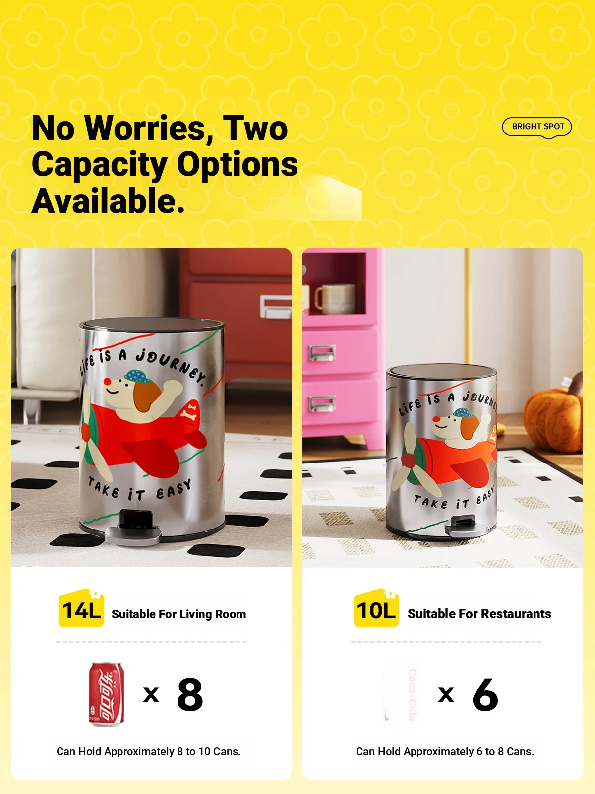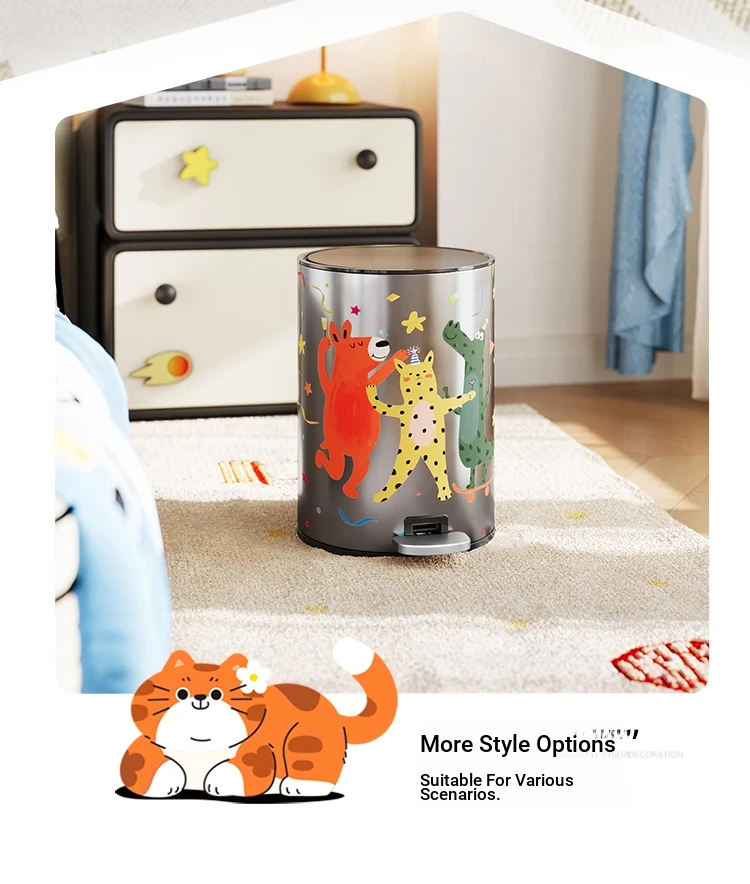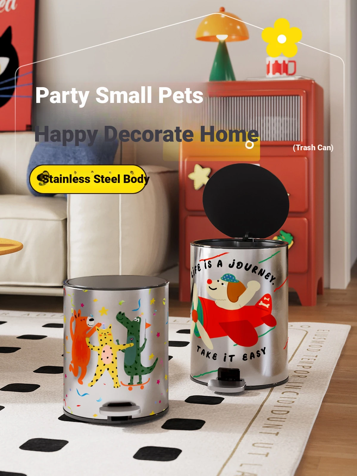 Stylish Stainless Steel Trash Can with Lid - Cute Cartoon Design Perfect for Living Room and Bedroom - Large Foot Pedal Household Bin
