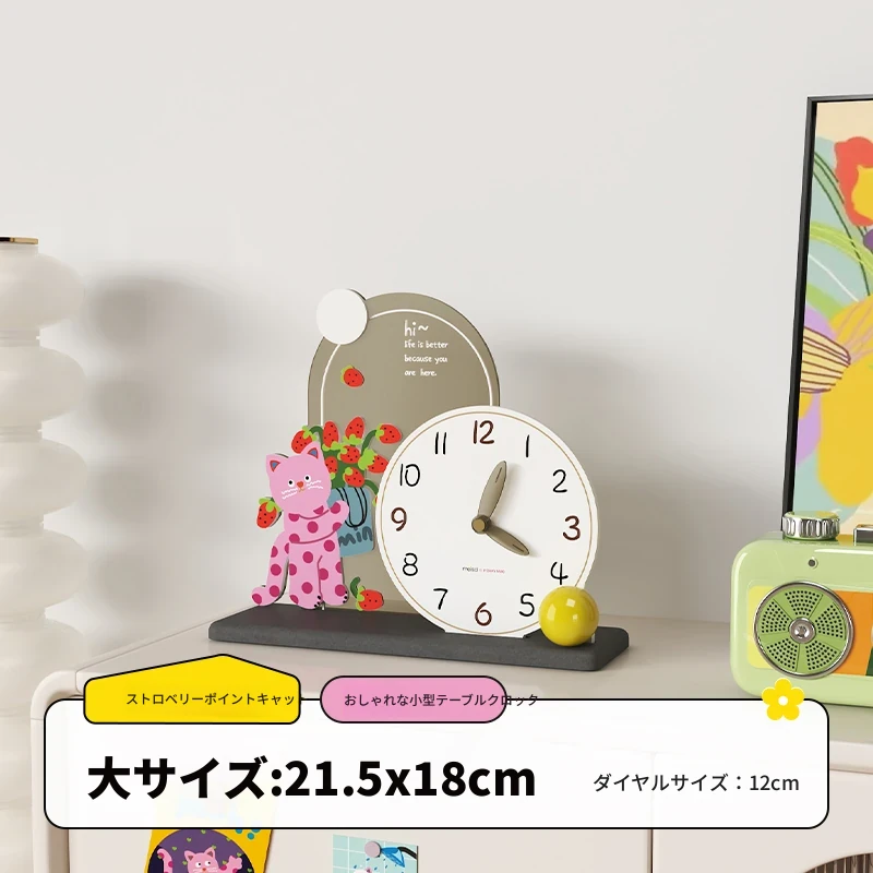 いちごドット猫台時計 21.5X18CM