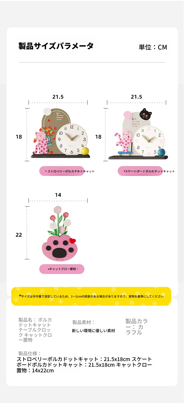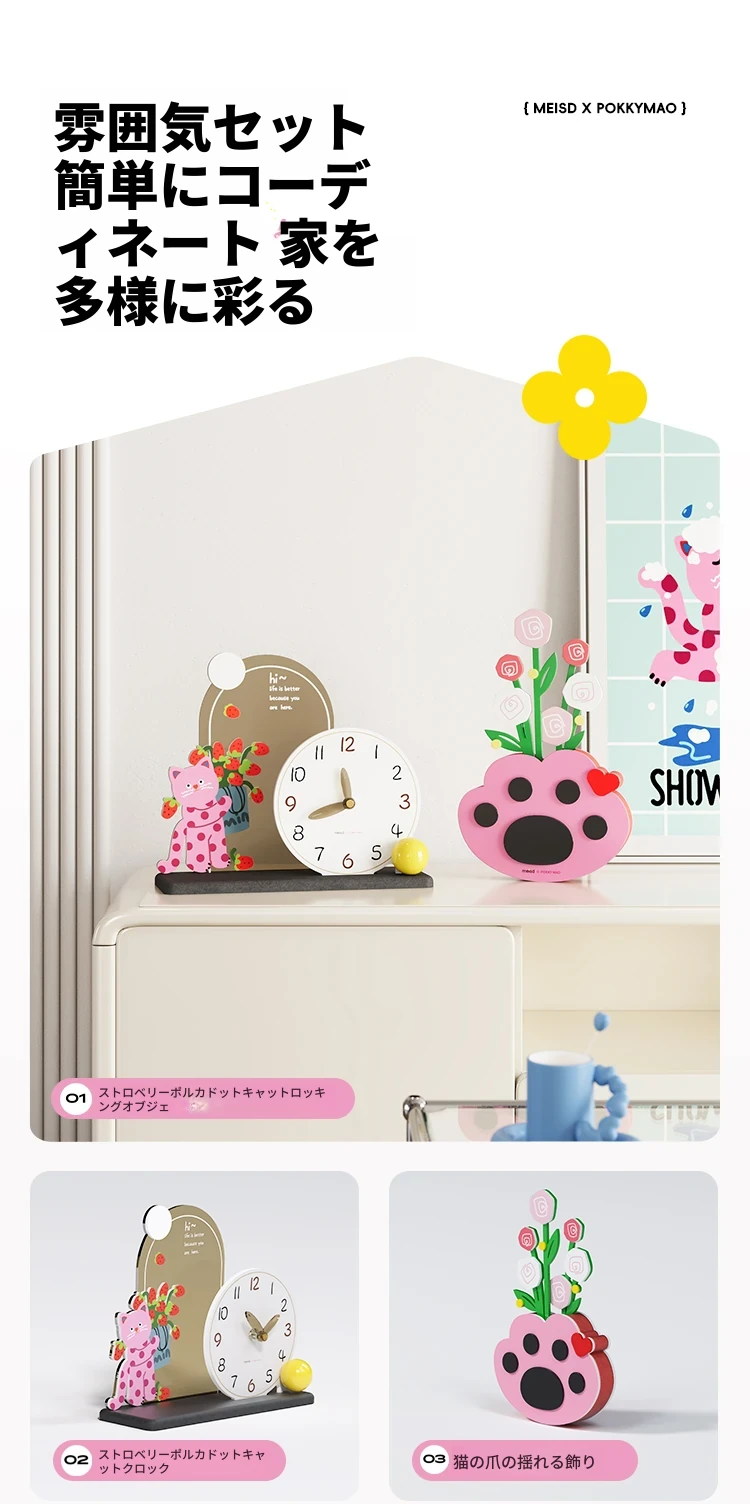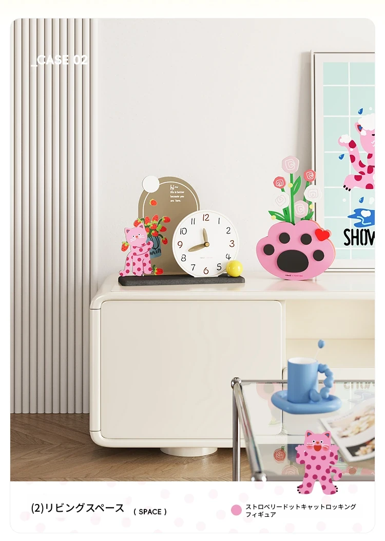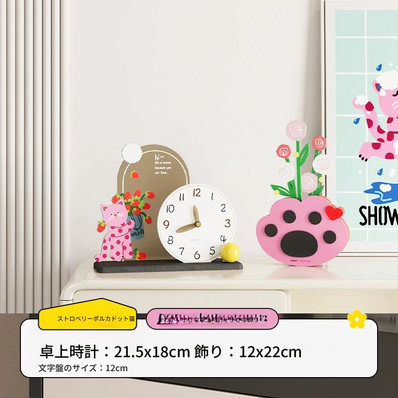 いちごドット猫台時計+猫の手花瓶飾り