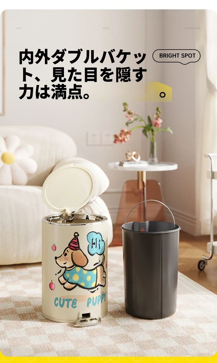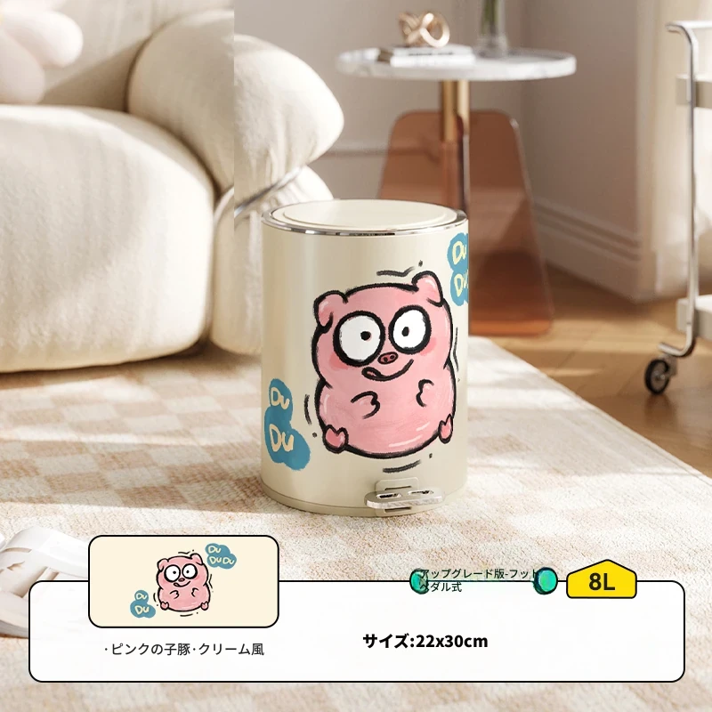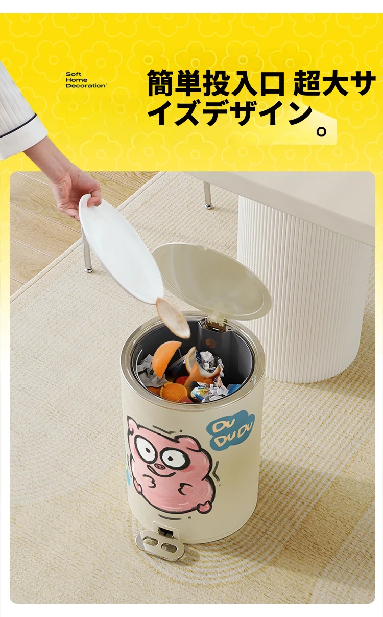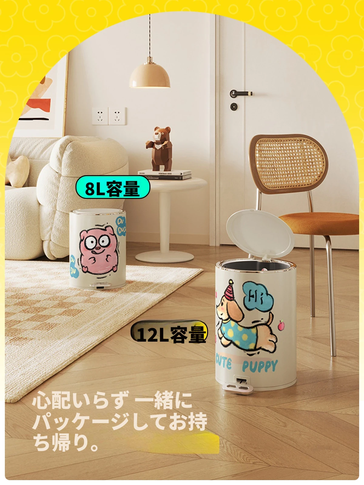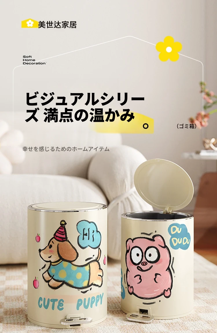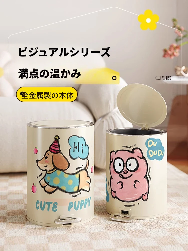 メイシーダ金属製ゴミ箱 - 高級感あふれるカートゥーンデザイン、クリームカラー!リビングや寝室にぴったりの大容量フットペダル式蓋付き。おしゃれで便利な生活アイテム!