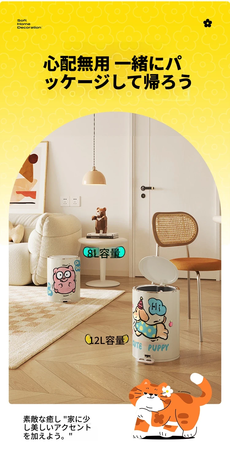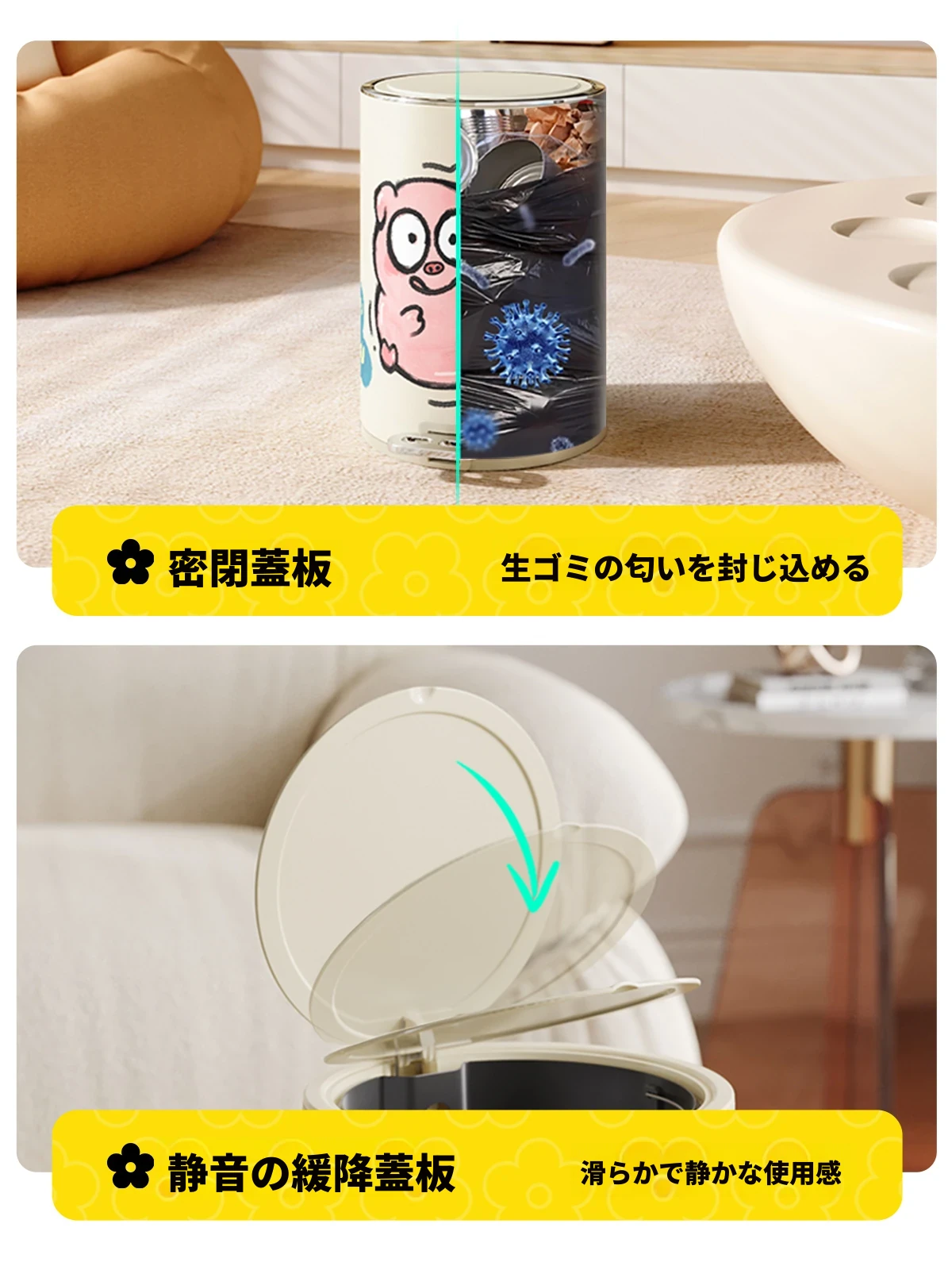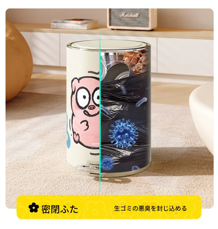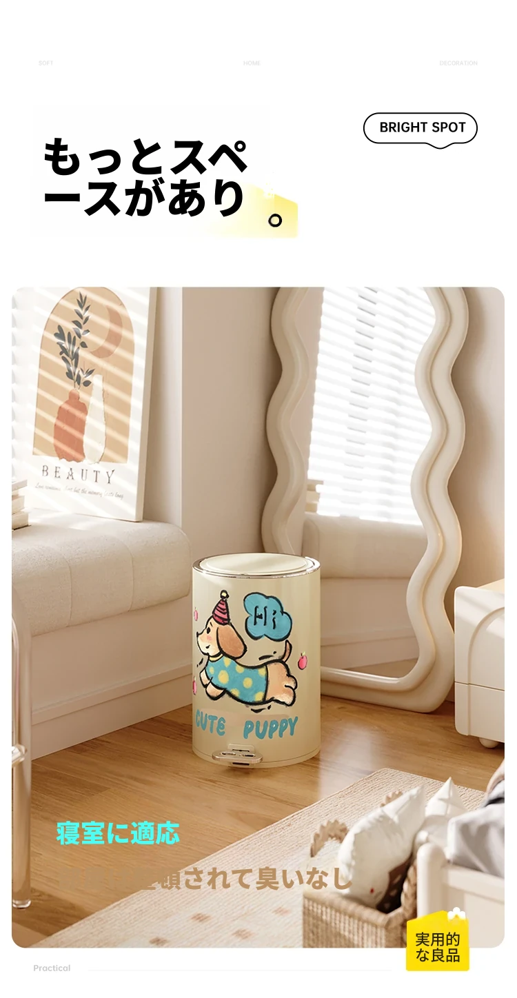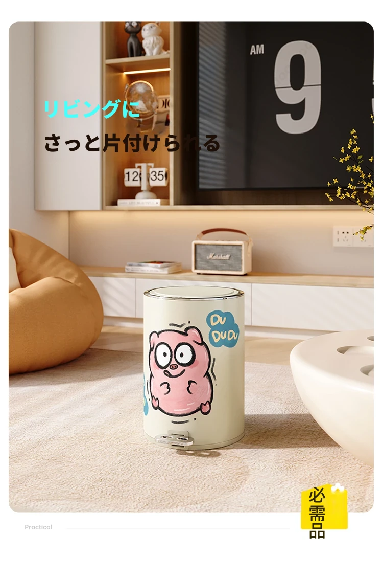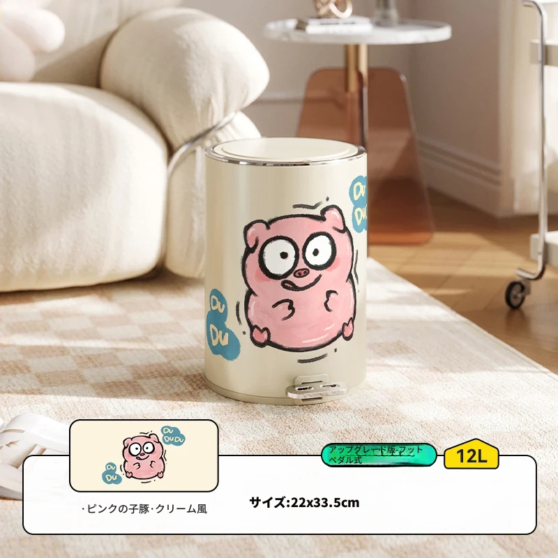 メイシーダ金属製ゴミ箱 - 高級感あふれるカートゥーンデザイン、クリームカラー!リビングや寝室にぴったりの大容量フットペダル式蓋付き。おしゃれで便利な生活アイテム!